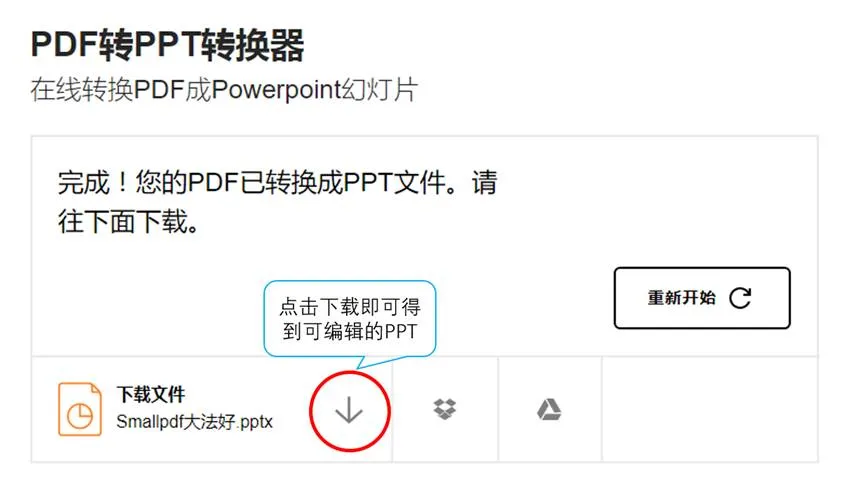 上传完成后就可以得到此页面,点击↓下载即可得到PPT文件,还原度非常高,赞!!!