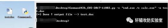 实验工具使用的是网上之前放出的Poc以及一个Command43b_CVE-2017-11882.py脚本文件,使用python执行Command43b_CVE-2017-11882.py文件: