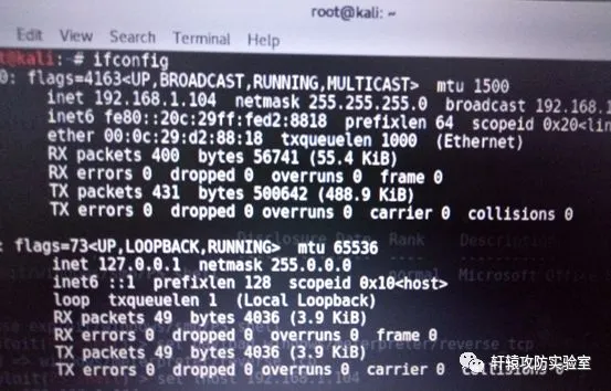 首先打开kali,查看IP,可以看到我的虚拟机kali的IP是192.168.1.104。