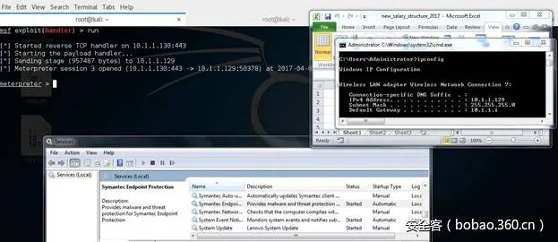 可以看到,在他打开后,我们成功收到了一个meterpreter反向shell,IP是10.1.1.129,从屏幕截图可以看到这台机器正在运行赛门铁克反病毒程序。