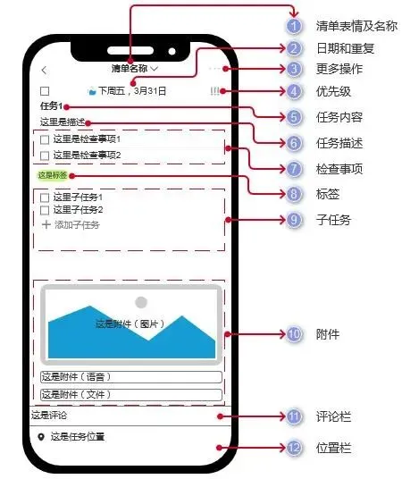 • 子任务与主任务一样,可添加日期、重复、优先级、描述、检查事项等信息。