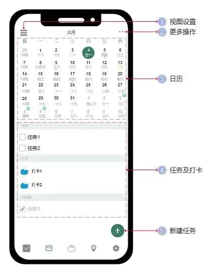 显示所选日期的任务(若日历中所选日期为今日或过去日期,则同时显示打卡信息),关于任务和打卡的操作在“任务列表页”和“打卡列表页 ”中进行说明,此处不再赘述。
