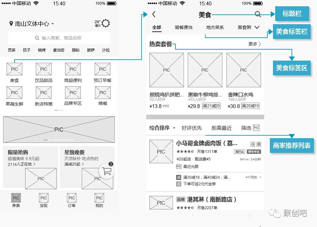 由于笔者绘制的App原型图完全参照个人手机屏幕的实际尺寸即(375px*677px),所以这里将首页(外卖页)分为上、中、下三个部分,并对相应的功能和操作进行逐一说明。