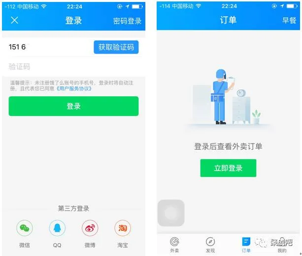 通过测试,笔者发现在未登录状态下用户除了订单页、用户“我的”页及在商家页面结算时会提示用户登陆或直接转至登陆界面,其他页面用户都可以随意查看浏览。由此可见,“饿了么”App对用户的“登陆/注册”引导性很低,然而考虑之前对“饿了么”多入口对应单出口的功能逻辑分析,这可能也是“饿了么”App采取的特有引导方式,即将“登陆/注册”功能设置在商家页面的结算出口处,针对不同使用场景及不同需求的用户,以此来适当增加用户对App的粘性。