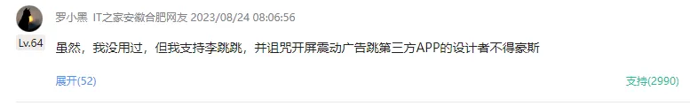 在各大平台,能看到网友们的评论,有对李跳跳的肯定,也有对开屏广告的不满。