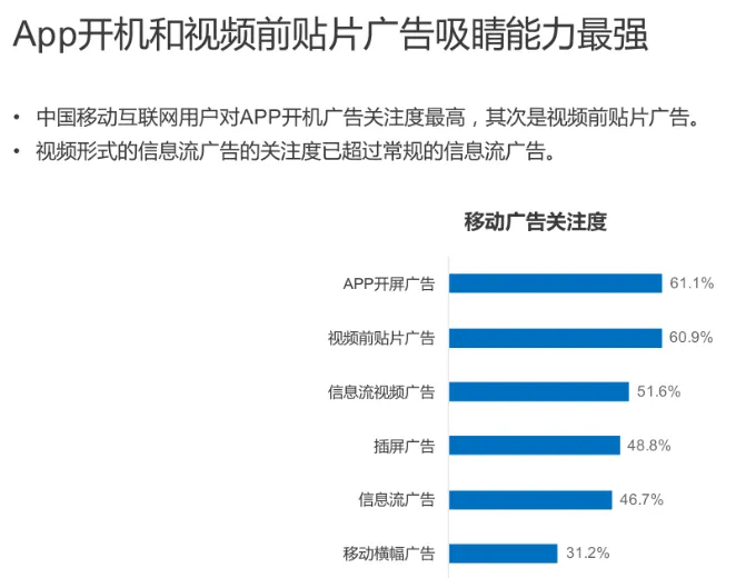 据 InMobi 发布的《2018 中国移动互联网用户行为洞察报告》显示:APP 开屏广告最具吸睛能力,用户对其关注度最高,可高达 61.1%。