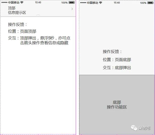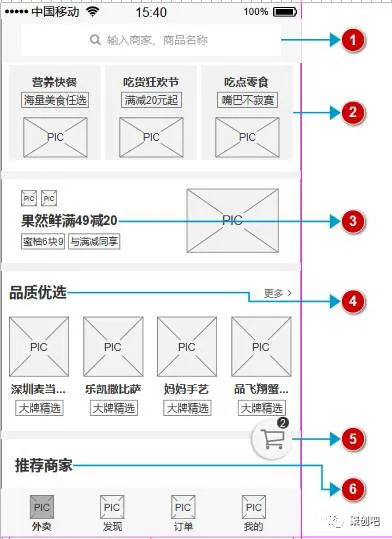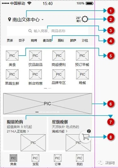 由于笔者绘制的App原型图完全参照个人手机屏幕的实际尺寸即(375px*677px),所以这里将首页(外卖页)分为上、中、下三个部分,并对相应的功能和操作进行逐一说明。