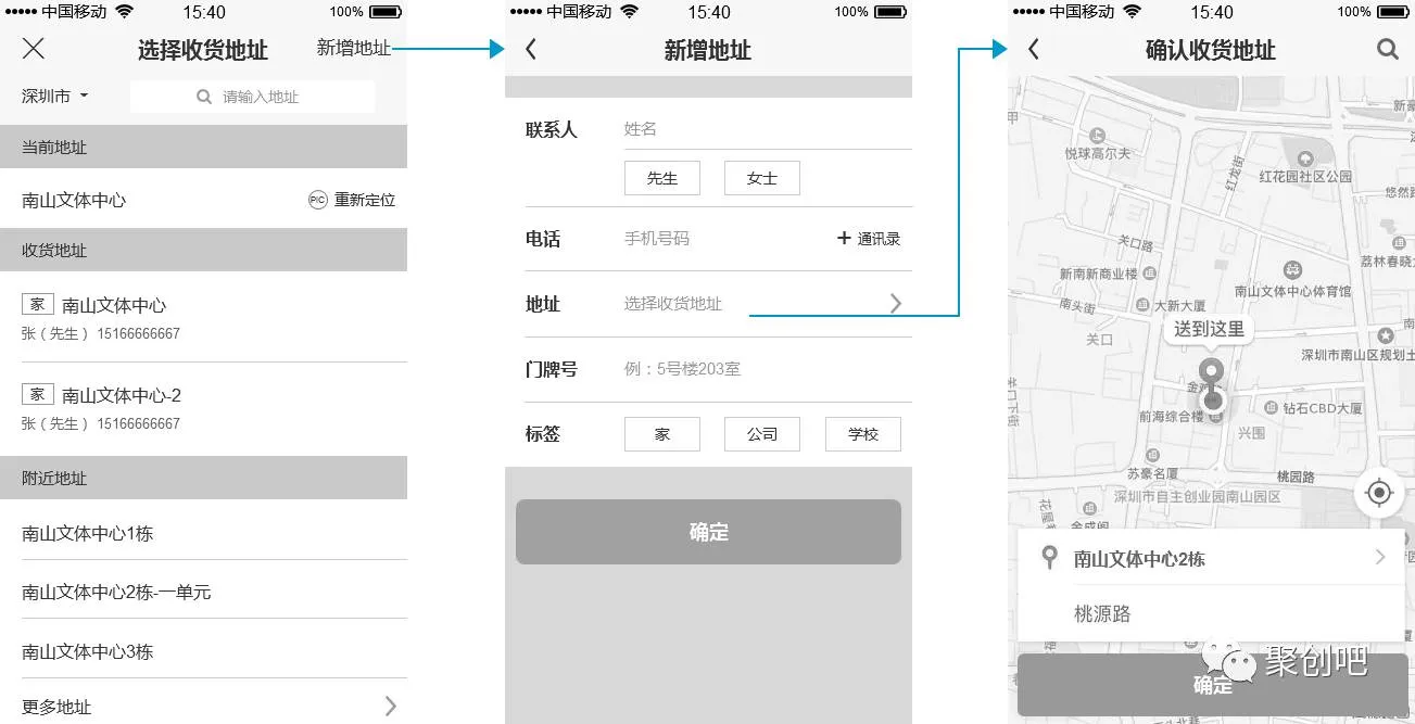 ① 用户位置定位:系统默认情况GPS自动定位并显示用户所在位置,点击后页面转至选择收货地址页面。
