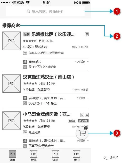 商家推荐列表中的商家信息由商家图片、名称、星级评分、月售订单数、起送价格、配送方式、配送费、配送时间、商家距离、商家促销活动以及商家保障等构成;·