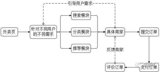 纵观整个外卖页的功能与结构,大体可以分为三大类功能模块即“搜索模块(搜索框)”、“分类模块(分类标签/分类专题)”与“推荐模块(推荐列表)”等。“饿了么”App用这三大模块功能对不同用户的不同需求提供相应的解决方案,然而看似三种甚至更多的用户需求入口,最终都会集中到同一出口即“具体的商家页面”,进而结算商品订单直至最终的交易完成,功能逻辑如下。
