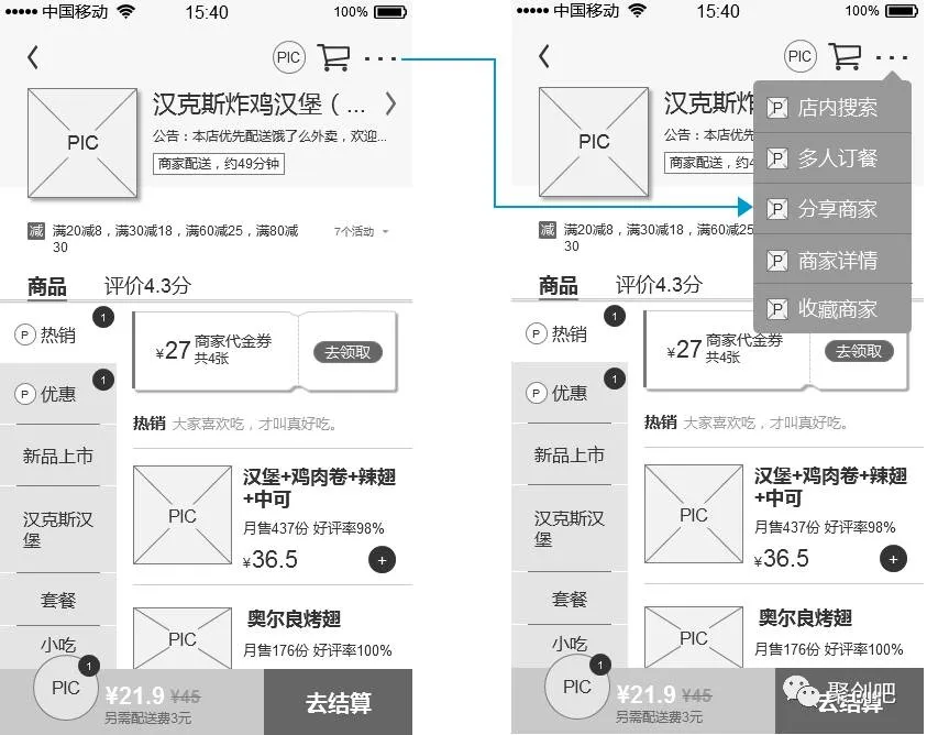 包含多人订餐、进入购物车以及更多操作按钮(“…”)。其中更多操作按钮在点击后弹出下拉列表菜单,菜单内容包括店内搜索、多人订餐、分享商家、商家详情页和收藏商家等功能,点击相应子菜单进入相应的功能页面。