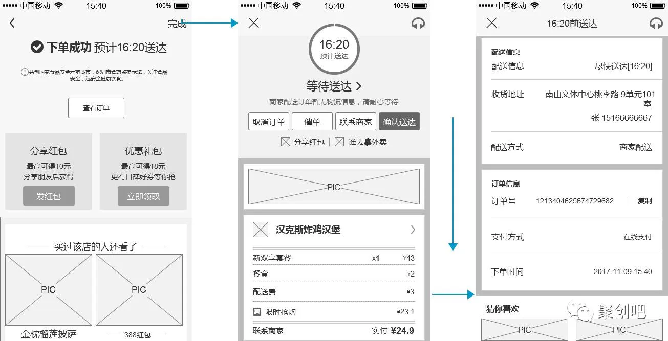 在用户下单支付后,系统会给用户派发分享红包及优惠代金券礼包,红包可以转发分享给好友,类似微信红包,随机领取相应的红包金额,而代金券礼包则是用户自己领取,也是随机金额。同时在等待订单的过程中,用户会接到“商家接单”及“配送员出发配送”的实时提醒,弹窗从页面顶部弹出。此外用户在订单完成页面点击右上角的完成按钮之后,页面转至等待送达的页面。