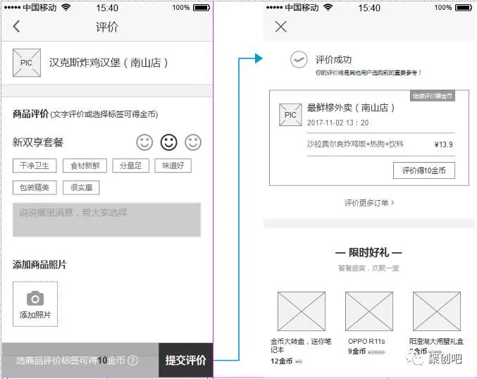 当用户在商品评价时输入了文字内容或选择了商品评价标签,在提交评价后会得到10金币,金币用于“饿了么”App内另一个页面功能(金币商城),在这里笔者暂不作说明。