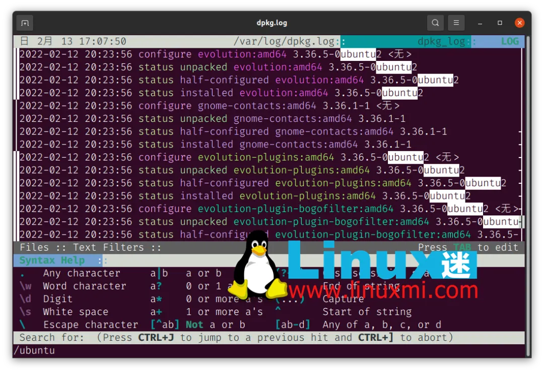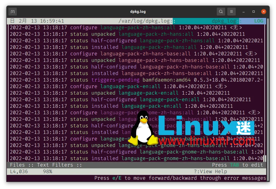 linuxmi@linuxmi:~/www.linuxmi.com$ lnav /var/log/dpkg.log
