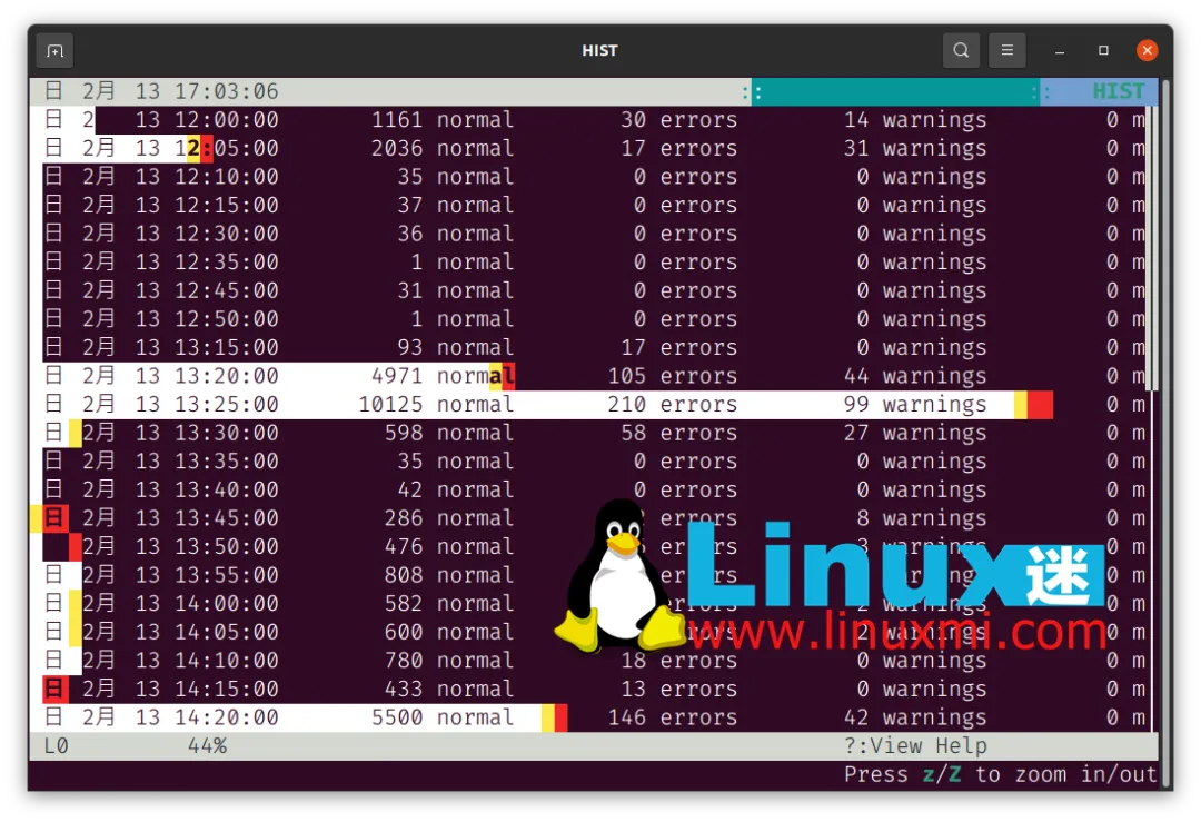 首先运行 lnav 然后按 i 键切换到/出直方图视图。