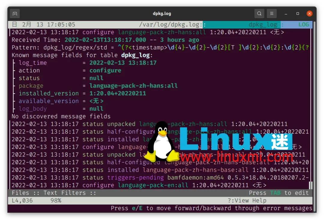 首先运行 lnav 然后按 p 键打开显示日志解析器结果。使用 lnav 查看特定日志文件要用 lnav 查看特定的日志文件,在 lnav 命令后面添加日志文件路径。例如我们想看 /var/log/dpkg.log 日志文件。