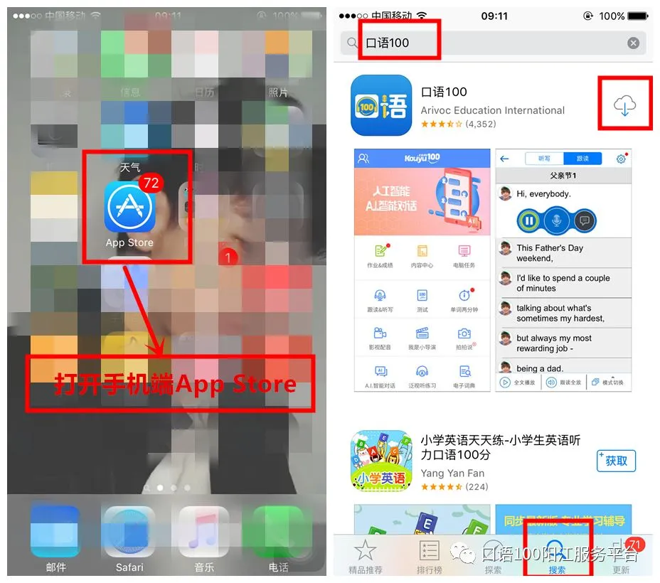 苹果系统:打开手机自带App Store(应用商店),搜索“口语100”点击获取安装即可!可根据下面图片提示操作!(备注:苹果三方下载软件爱思助手、PP助手也可下载安装,只是会出现经性闪退或者客户端不稳定情况,所以建议使用官方下载软件App Store)