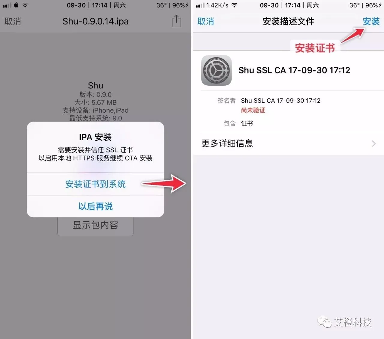在使用安装前,需要安装并信任SSL证书。如下图所示。注意:示例为iOS 9系统,iOS 10+系统需要到设置→通用→关于本机→证书信任设置→针对根证书启用完全信任中打开信任开关。