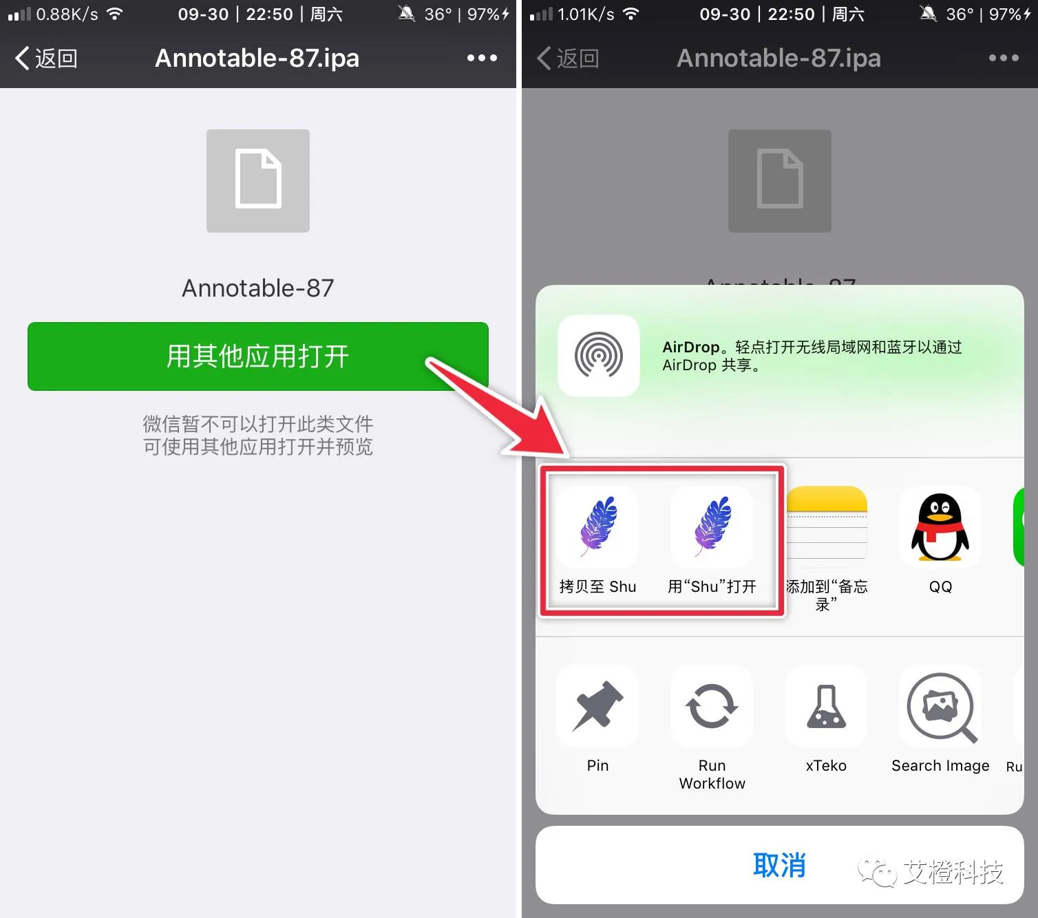 例如,微信里面收到的ipa格式应用安装包,用其他应用打开,选择“拷贝至 Shu”或者“使用 Shu打开”。注意:如果分享扩展面板没有出现Shu,请向左滑动至最右,点击更多,打开Shu的相关开关添加到扩展面板。
