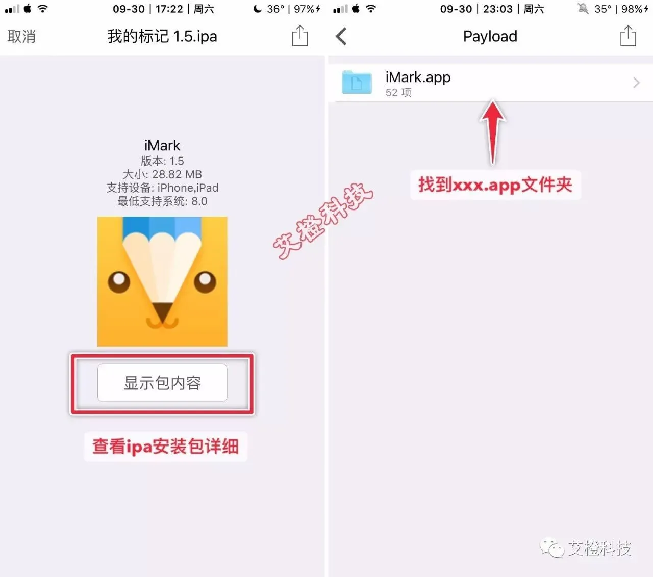使用方法是,在Shu内打开已经导入的ipa安装包,点击显示包内容。如下图所示,我的标记(iMark)这个软件。