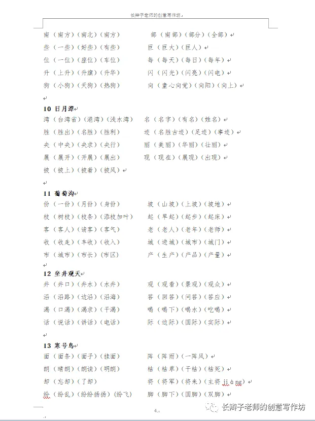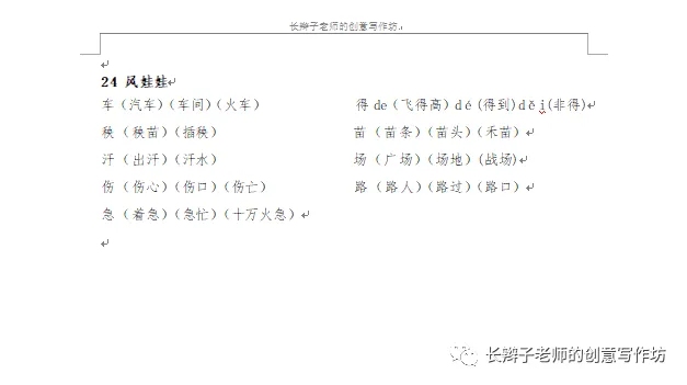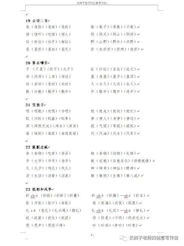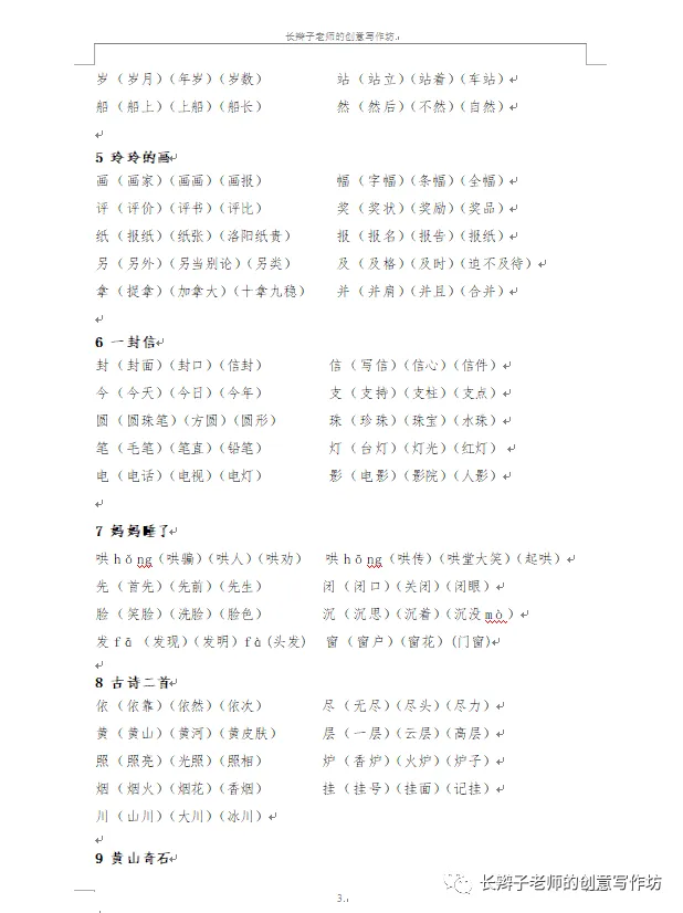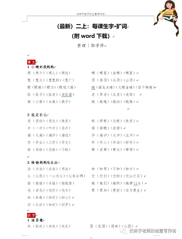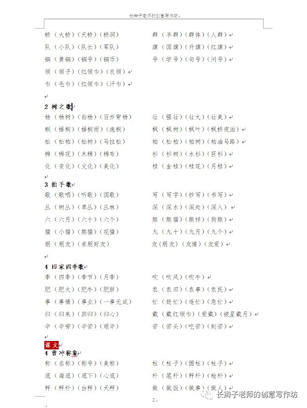 若需要《二上全册生字扩词》,请关注微信公众号“长辫子老师的创意写作坊”,在首页留言区写下4个字——二上扩词,便会自动弹出提取链接。
