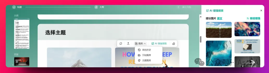 点击要更换的图片,不仅可以在万知自带的库里寻找,还可以有AI增强搜索,如果还没有满意的图片,万知更是贴心的为用户准备了“继续增强”(其中也内置了多种进一步描述)