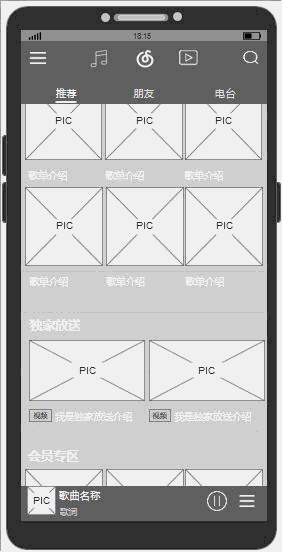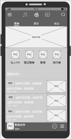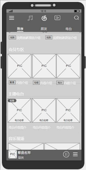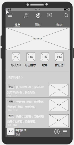 本文倒推的是网易云音乐APP,由于功能入口繁多,本文在功能需求与交互的部分,只以主要流量入口“发现音乐-推荐”示例。以下是我的原型截图: