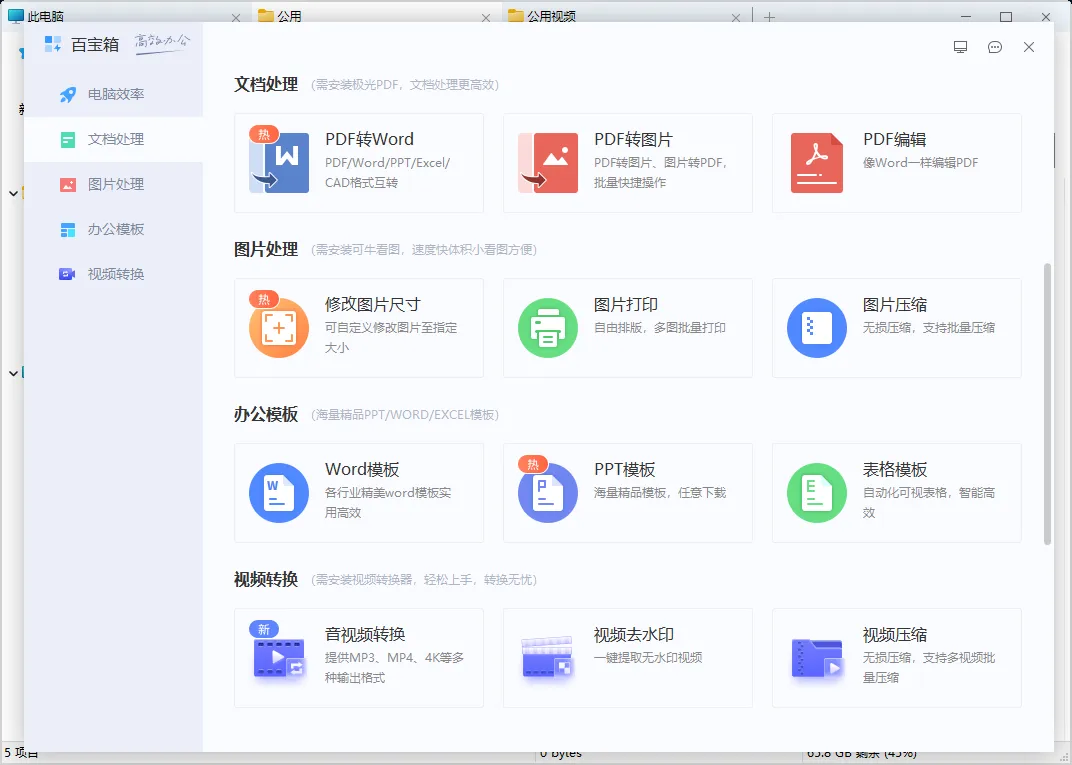 其它小工具还蛮多,四大类,电脑效率、文档处理、图片处理、办公模板、视频转换,基本上都是日常可能会用到的工具。