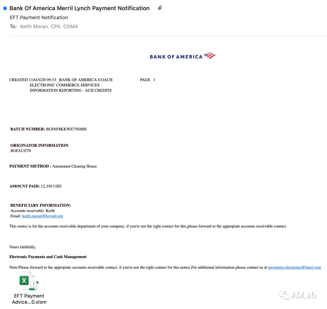 海毒蛇(SeaViper)”黑客组织曾通过一封题为“电子转账付款账单”的恶意邮件,以“美国银行”的名义发起钓鱼邮件攻击,他们以excel表格为附件,通过多级代码跳转,最终向目标计算机植入木马Remcos,窃取目标主机的机密信息。