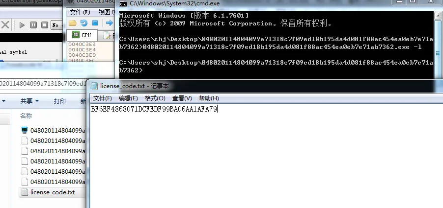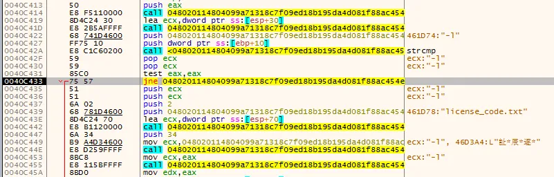 在开始调试不远处就有一个字符串比较函数 strcmp,通过分析发现可以使用命令行参数 44.exe -l 来生成一个 license_code.txt 文件。