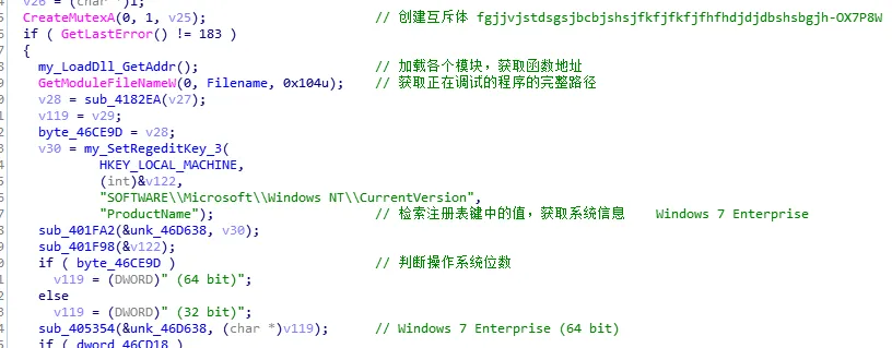 创建互斥体fgjjvjstdsgsjbcbjshsjfkfjfkfjfhfhdjdjdbshsbgjh-OX7P8W,此外还会获取一些模块的导出函数,检索注册表中的键值,获取操作系统的信息。
