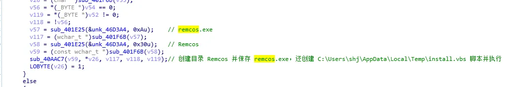 接着执行新创建的install.vbs脚本代码,它首先会创建FileSystemObject对象fso,然后创建wscript.shell对象调用run方法运行remcos.exe,最后fso调用DeleteFile方法删除脚本自身,最后退出调试。