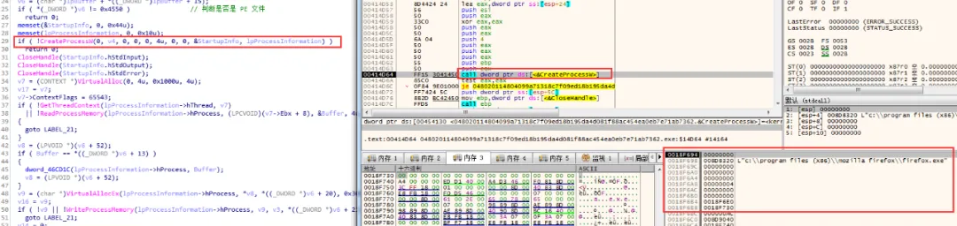 创建firefox.exe 进程,在其内存中写入代码