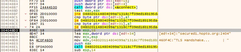 使用TLS协议与C2服务器建立通信,连接域名secured1.hopto.org,解析出的IP为104.215.84.159