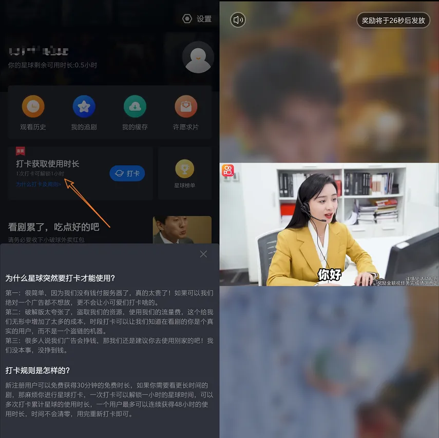 这次归来,在最新版中植入了大量广告,用户需要通过“打卡”来换取观影时长,打一次卡可以换取一小时的观影时间,这里的打卡就是观看广告。