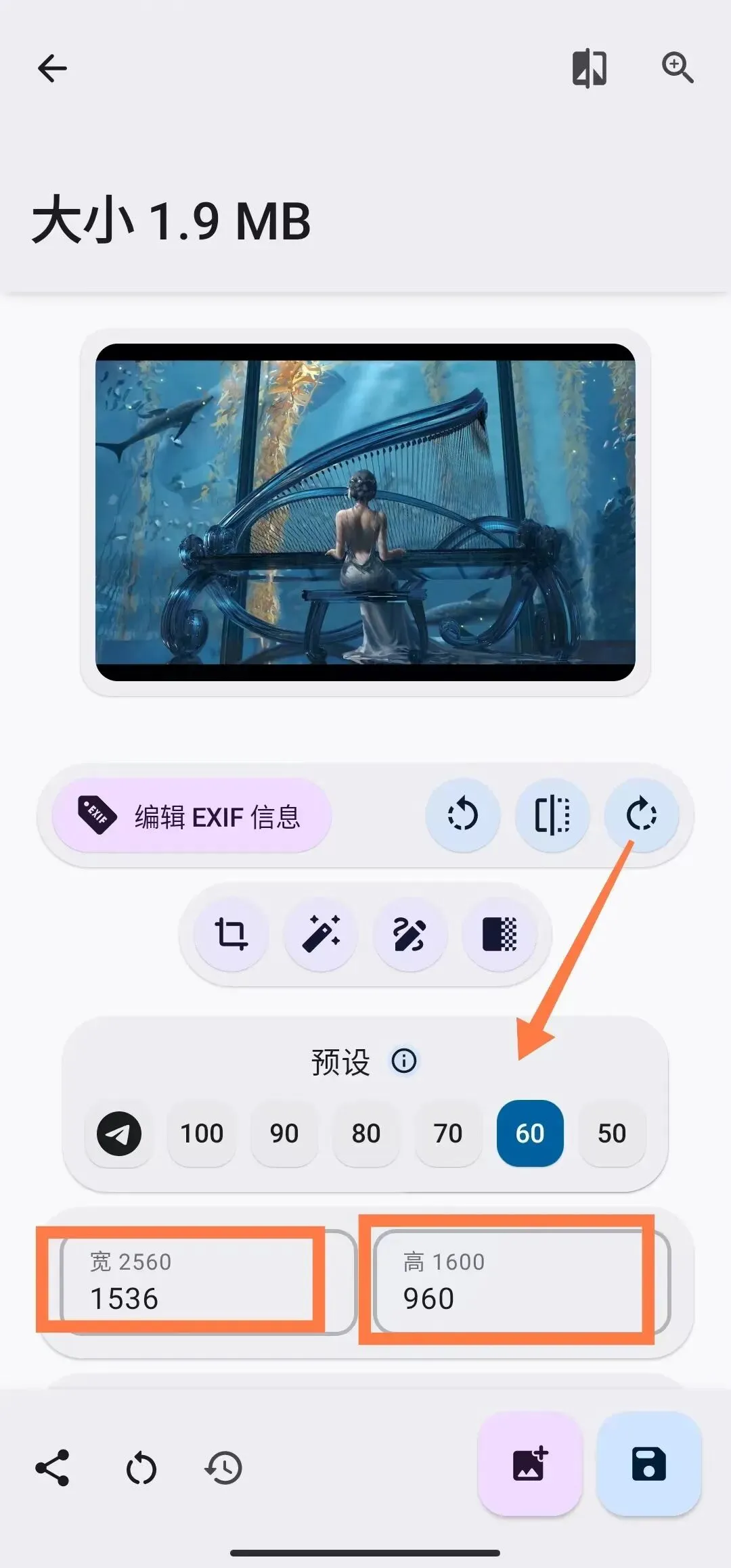 下面我以“缩放单张图片”为例,原图大小为5M,宽为2560,高为1600,缩为60%后(你也可以选择其他的百分比进行缩放),宽变为了1536,高变成了960,大小也变成了1.9M。