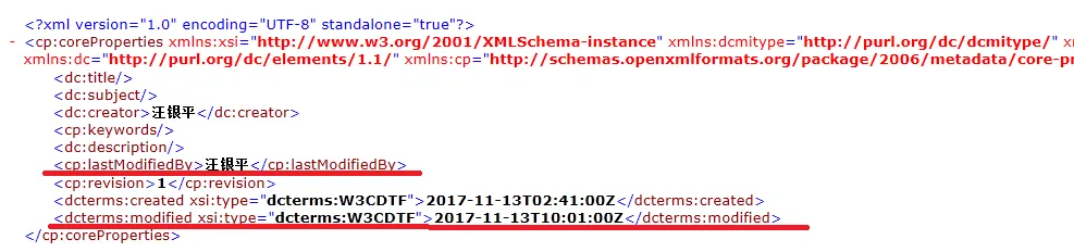 OFFICE文档的元数据主要包含:Title(标题)、 Word软件版本、Creator(文档创建者)、LastModifiedBy(最后修改者)、文档创建时间、最后一次保存时间、最后一次打印时间等(如下图所示)。