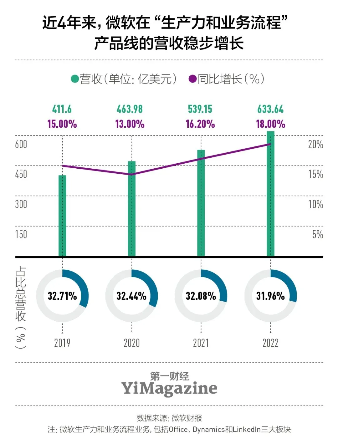 来自办公软件的收入已成为微软的三大支柱之一。2022财年,微软在“生产力和业务流程”(包括Office、Dynamics和LinkedIn)业务线实现的营收同比增长18%至633.64亿美元,占总营收比例为31.96%。2016年至2022年,Office业务收入复合增速为11.09%。