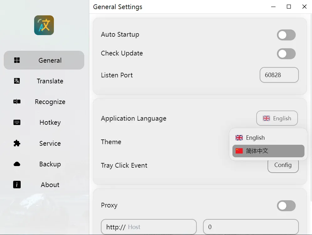 软件初次安装后,可以在常规设置中找到“Application Language”应用语言将英文改为简体中文设置