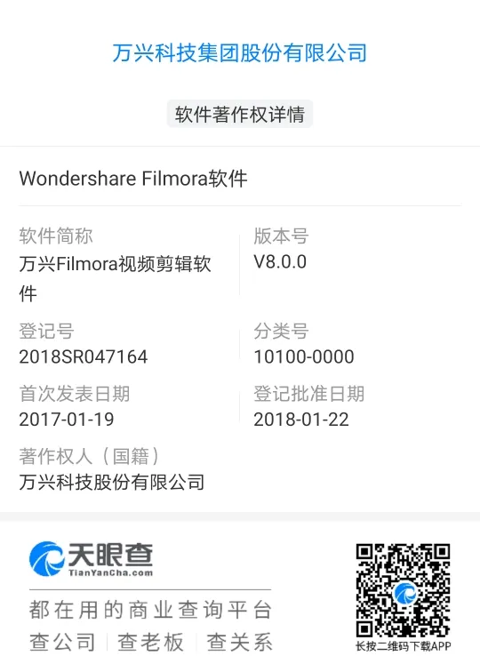 从天眼查APP上可以查到,Filmora的著作权所属公司是位于深圳的万兴科技有限公司。