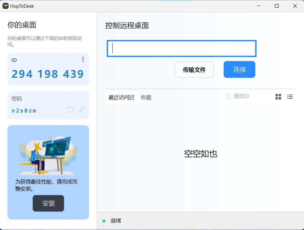 启动软件之后,左侧会显示当前电脑的专属 ID,ID 是一个固定的 9 位数字,在没有更换硬件的情况下理论上不会变动。