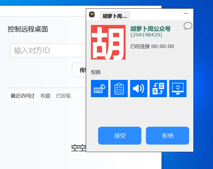连接发起之后,被控制端电脑会弹出连接请求提示窗口,我们可以选择接受还是拒绝。