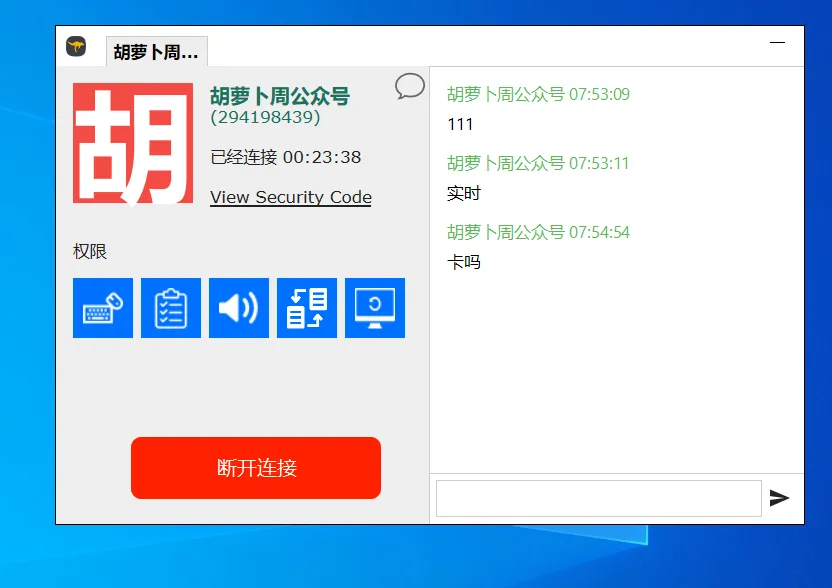 在显示窗口顶端位置,还分布有一列功能按钮,依次是「聊天消息」、「控制操作」、「显示设置」、「键盘设置」、「录屏」以及「安全码」。