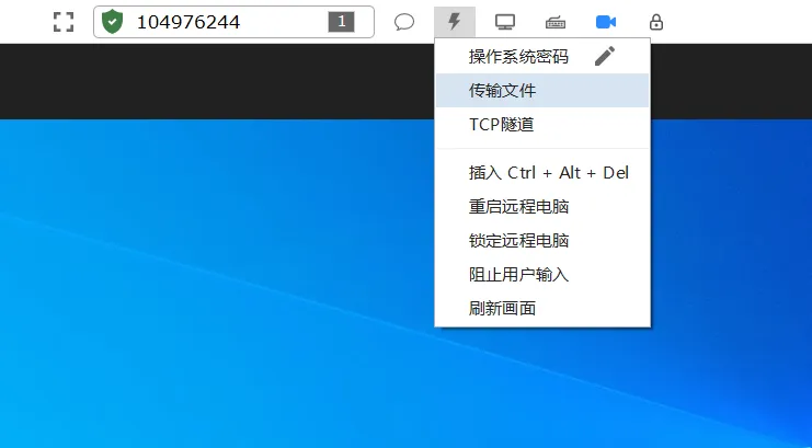 点开「控制操作」–「传输文件」菜单,还可以在两端电脑之间互相传输文件。