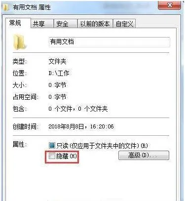 2.点击鼠标右键,在“属性”对话框里,勾选“隐藏”选项,这时文件会自动隐藏。