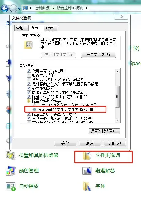 3.如要再次打开此文件,需在控制面板中打开“文件夹”选项点击“查看”按钮,勾选“显示隐藏的文件、文件夹和驱动器”即可。