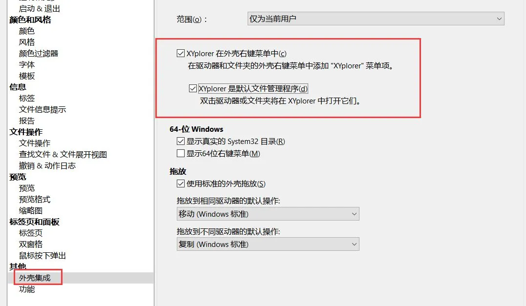 这款软件体积只有不足 4M 就算是开机自启也不会影响电脑的速度。若想要这款软件代替自带的文件资源管理器,则在工具–>-配置->外壳集成,勾选XYplorer是迷人文件管理程序。