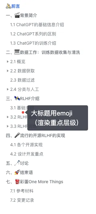 如果一篇文章比较长,有可能是好几千字或者是万字长文。可以考虑在大标题的前面加个表情包,不过度浮躁,然后又起到了渲染重点层级的作用。这样一来,读者一看到标题,就能更快速地找到文章的几个核心思路,然后一步步读下去。具体示例如下: